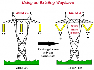 Благодаря преимуществам (см. выше) одна и таже ЛЭП может передать в 3 раза больше энергии при переходе с технологии HVAC к HVDC [19]: