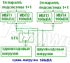 2*(N+X) - имеется 2 параллельных системы (каждая N+X) Такая система может питать как двухвходовые нагрузки так и одновходовые нагрузки через STS См. рис. ниже: |